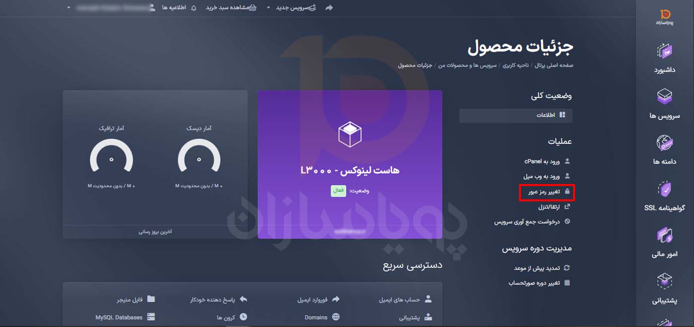در صورتی که از صحیح بودن کلمه عبور در اختیار اطمینان ندارید، می توانید با مراجعه به پرتال کاربری و کلیک بر روی مدیریت سرویس هاست مورد نظر با استفاده ازگزینه "تغییر رمز عبور" نسبت به تغییر کلمه عبور دسترسی به سی پنل اقدام(همچنین می توانید جهت ریست پسورد سی پنل یک درخواست به بخش پشتیبانی ارسال نمایید) و یا با ورود به کنترل پنل کلمه عبور دسترسی به ایمیل و یا اکانت ftp را اصلاح نمایید.